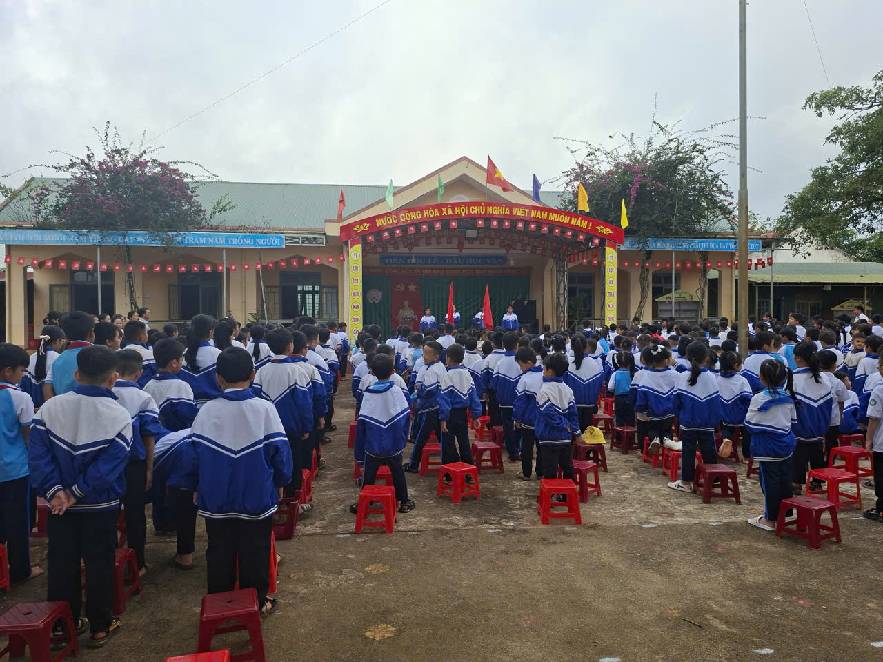 Toàn thể học sinh và giáo viên nghiêm trang, hướng ánh mắt về lá cờ đỏ sao vàng – biểu tượng của niềm tự hào dân tộc, của tinh thần đoàn kết và ý chí Việt Nam.
