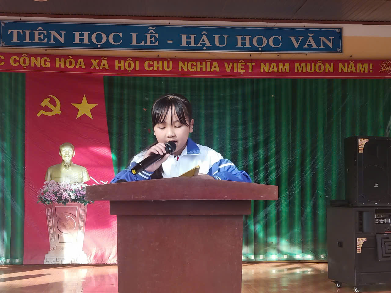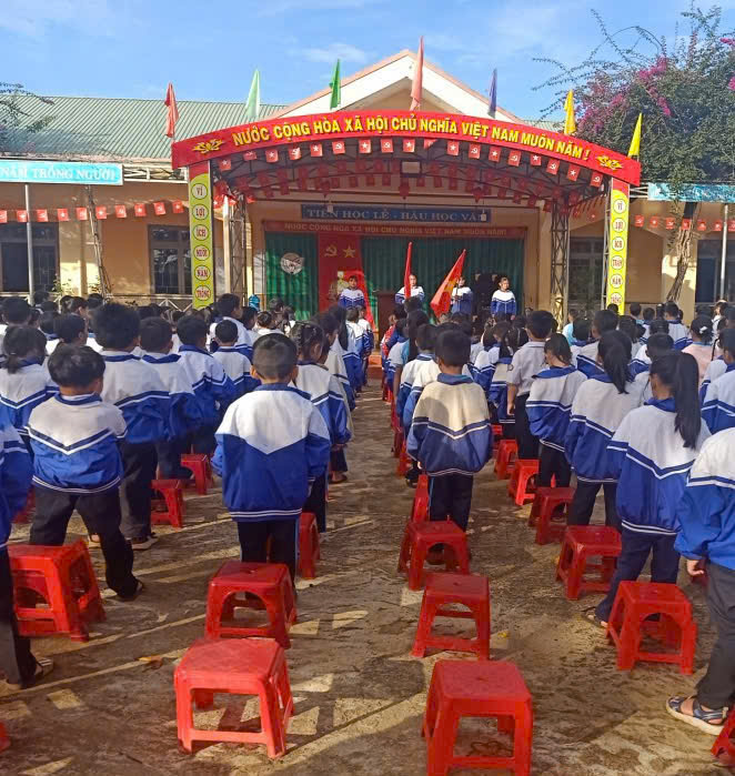 Tiếng trống trường vang lên báo hiệu giờ chào cờ bắt đầu. Toàn thể cán bộ, giáo viên và học sinh nhanh chóng ổn định hàng ngũ. Dưới lá cờ Tổ quốc tung bay, buổi lễ diễn ra trang nghiêm với các nghi thức truyền thống: chào cờ, hát Quốc ca và Đội ca. Giọng hát trong trẻo, đầy tự hào của các em học sinh hòa cùng giai điệu thiêng liêng của Quốc ca như tiếp thêm niềm tin và tình yêu quê hương, đất nước.