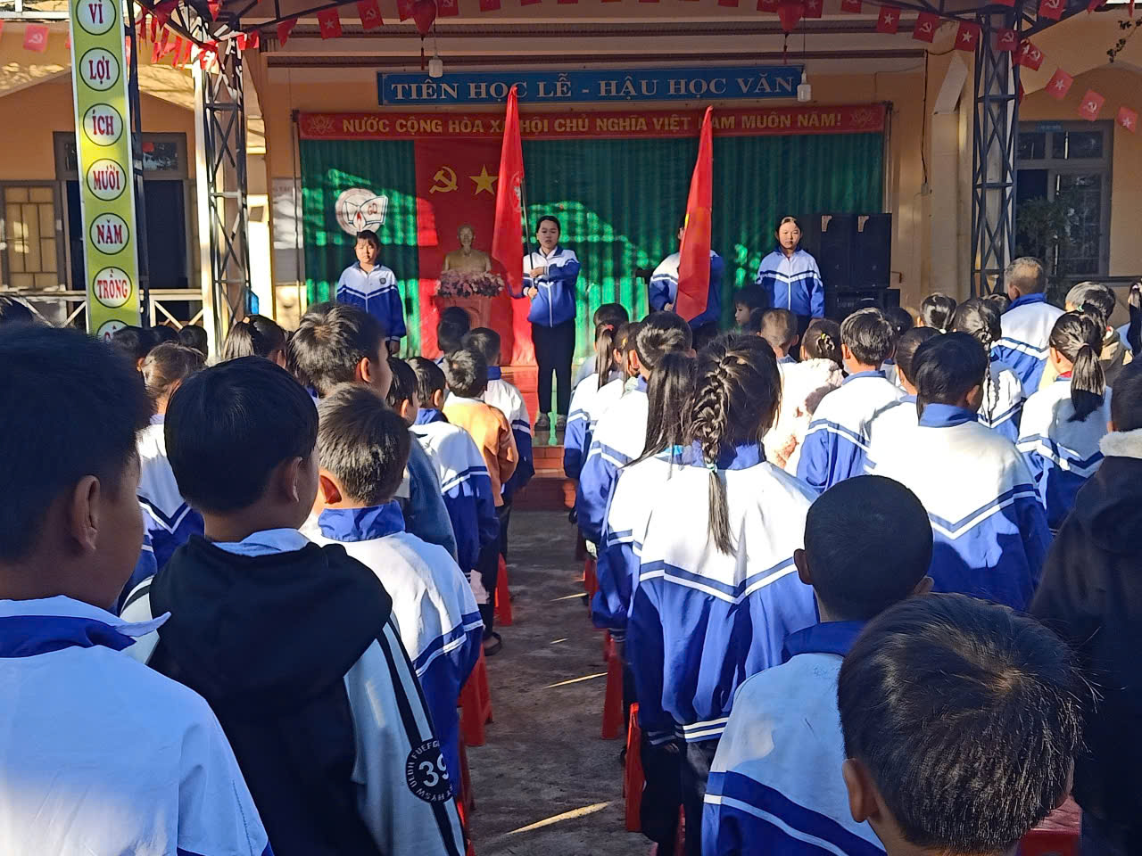 Buổi lễ bắt đầu bằng nghi thức chào cờ và hát Quốc ca. Dưới lá cờ Tổ quốc tung bay, tiếng Quốc ca vang lên trang nghiêm, thể hiện tinh thần kỷ luật, lòng tự hào và ý thức trách nhiệm của mỗi thầy cô giáo và học sinh trong thời khắc chuyển giao của năm cũ.