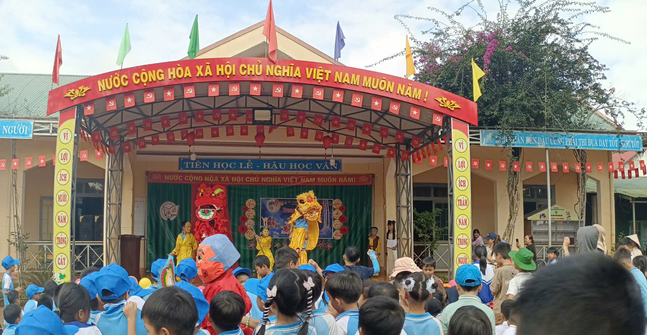 Sáng thứ Sáu, ngày 03/10/2025, Trường Tiểu học Trần Quốc Toản (thôn 4, xã Trường Xuân, tỉnh Lâm Đồng) rộn ràng trong không khí chuẩn bị cho Lễ hội “Trung Thu Yêu Thương”. Từ sớm, sân trường đã khoác lên mình diện mạo tươi mới với phông nền, cờ hoa và sân khấu rực rỡ sắc màu. Các em học sinh trong trang phục Chú Cuội, Chị Hằng, ông Địa, Ngộ Không, Bát Giới, váy múa rực rỡ đã tề tựu đông đủ, nở nụ cười hồn nhiên, háo hức chờ đón ngày hội.